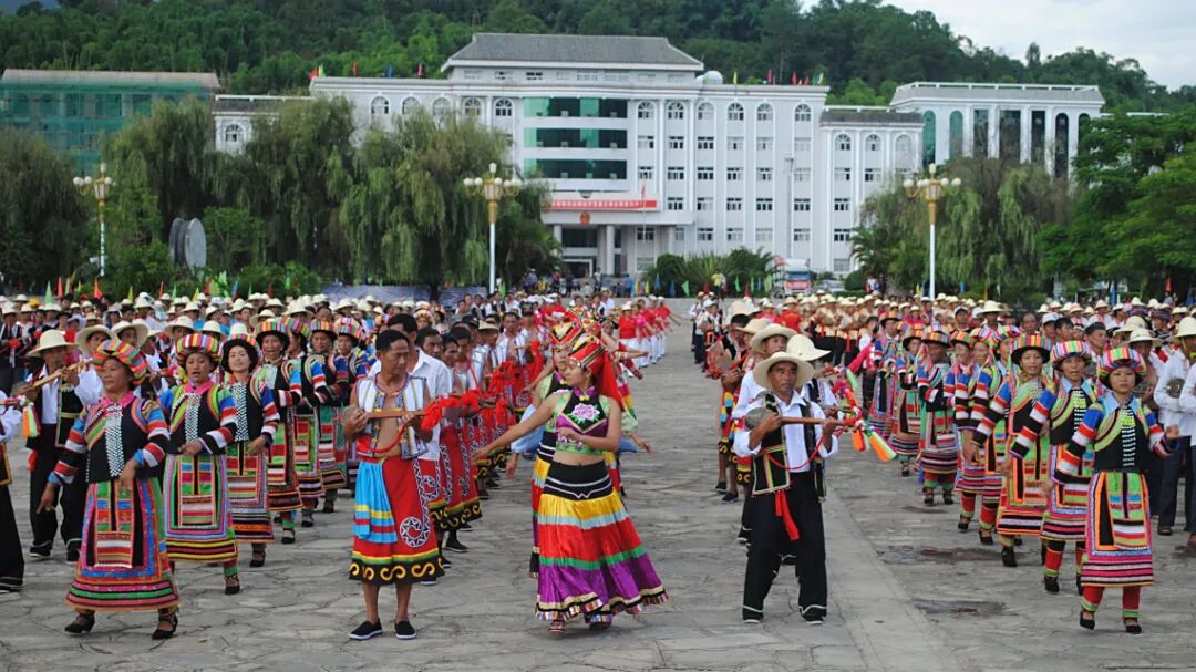 如今的阿数瑟,早已不是旧时局限于特定场合的表演,而是镇康人“男女皆宜,老少都唱”的生活方式。在农家婚礼上,人们围着圈,弹起三弦、吹起葫芦笙,从深夜唱到天明;在南伞的文化广场上,茶余饭后的群众自发组队,踩着节奏载歌载舞;甚至在全县的校园里,孩子们正跳着改编成课间操的阿数瑟打歌,让文化的种子在童年发芽。